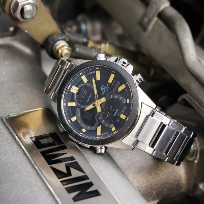 EDIFICE Premium charakteryzuje się wysoką jakością wykonania czasomierzy oraz dbałością o każdy detal. Solidna konstrukcja wykonana ze stali szlachetnej 316l, która jest odporna na czynniki zewnętrzne, idealnie komponuje się z ciekawie zaprojektowaną tarczą z przykuwającymi uwagę złotymi elementami. Przemyślanie umieszczone sub-tarcze na cyferblacie mają przypominać wnętrza wyścigowych samochodów.