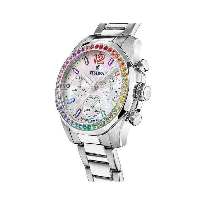 Elegancki, biżuteryjny damski zegarek Festina F20606/2 z kolekcji Boyfriend w srebrnej kolorystyce z piękną tarczą wykonaną z masy perłowej. Uwagę zwracają również błyszczące, kolorowe kryształki na obwodzie koperty.