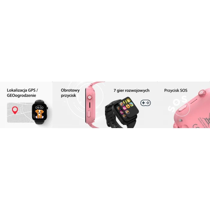 Dodatkową funkcją smartwatcha dziecięcego jest wbudowany przycisk SOS, pozwalający na szybkie połączenie z rodzicem ale także krokomierz, budzik czy możliwość zdalnego podsłuchu urządzenia.