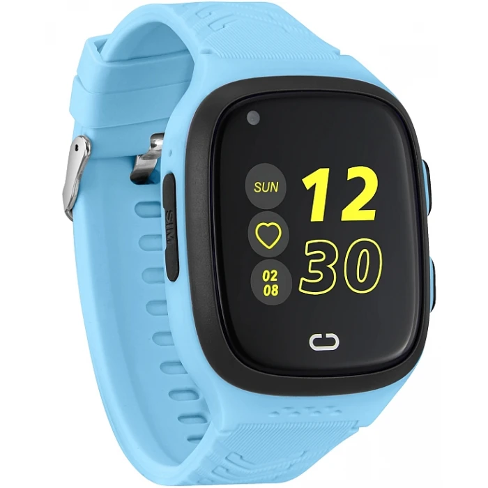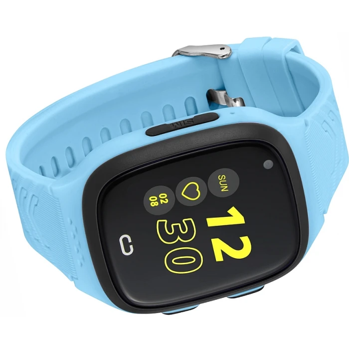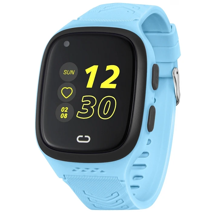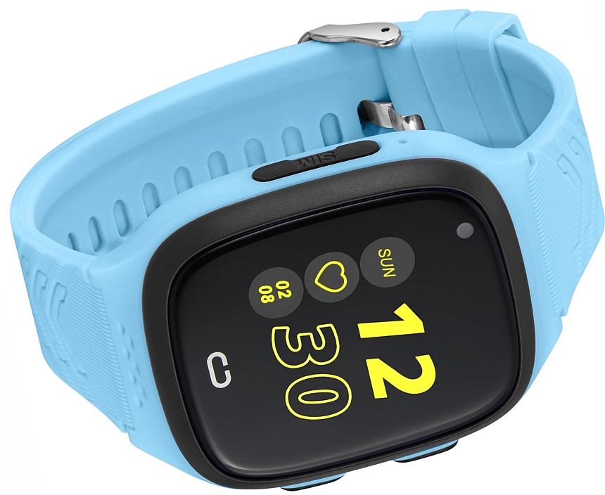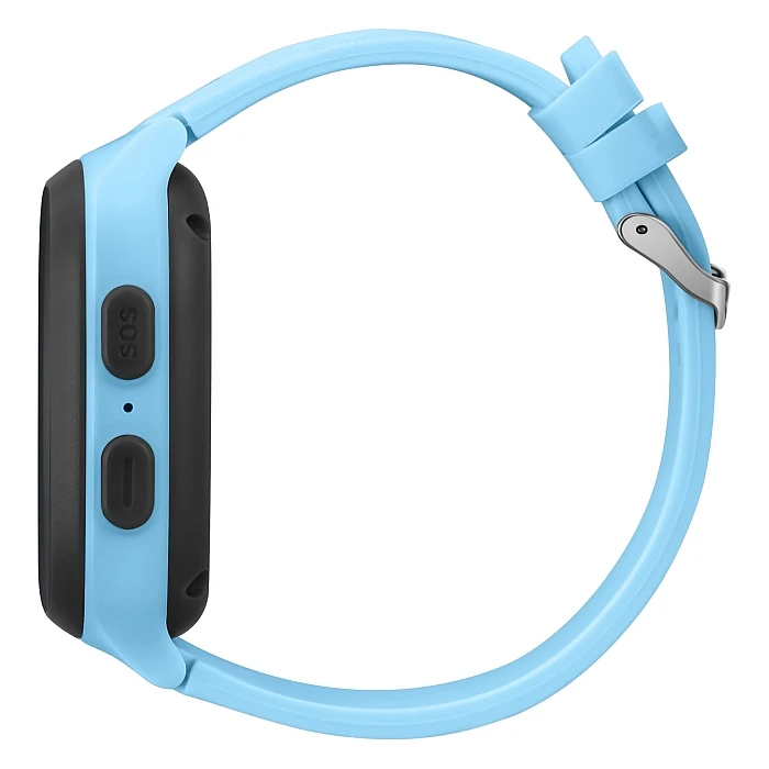 Smartwatch dziecięcy zamknięty w prostokątnej kopercie z dwoma przyciskami z boku, zawieszony na wygodnym pasku.