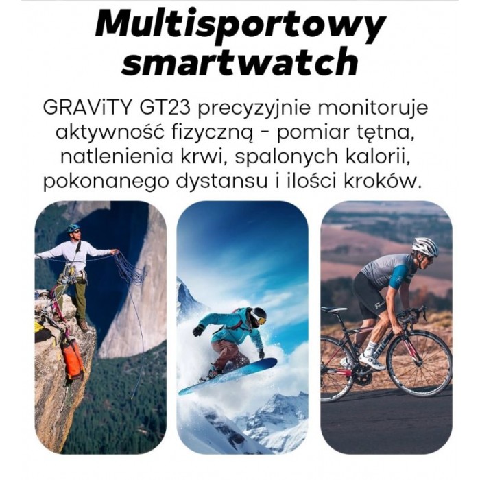 GT23-1 łączy w sobie nowoczesne, prozdrowotne funkcje i sportowy design. Głównym celem marki jest zapewnienie satysfakcji klientom ceniącym sobie funkcjonalność, jakość i przystępną cenę. Ten sportowy model świetnie sprawdzi się podczas aktywności czy treningów, ponadto pozwoli uzupełnić codzienną stylizację o modny dodatek.
