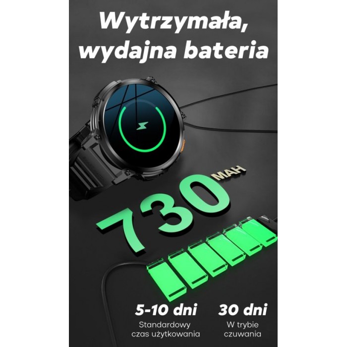 Okrągły ekran IPS o przekątnej 1,85 cala, który jest w pełni dotykowy o rozdzielczości 360x360pikseli , zapewnia jakość HD i optymalną przejrzystość oraz czytelność nawet przy intensywnym świetle słonecznym! Wydajność baterii to 5 dni, przy aktywnym użytkowaniu - włączony monitor pracy serca, tryb multi-sport, aktywne powiadomienia z aplikacji społecznościowych. Czas czuwania do 30 dni - wyłączony Bluetooth, pulsometr i inne funkcje.