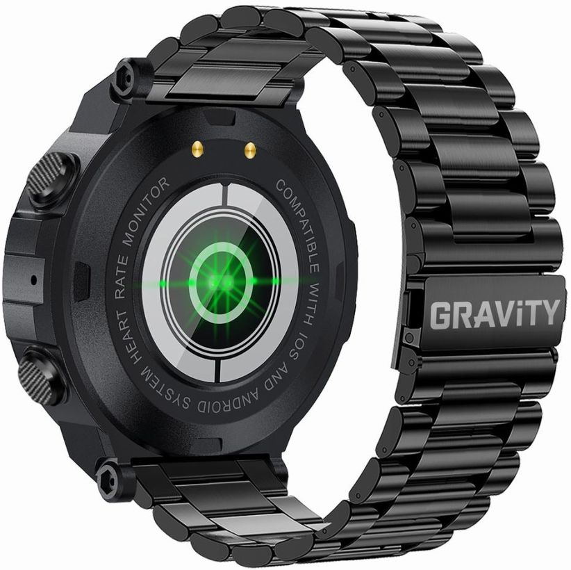 Wielofunkcyjny smartwatch Gravity posiada kopertę o średnicy 45,4mm w czarnym kolorze, czarną wykonaną ze stali szlachetnej bransoletę, pełny, dotykowy wyświetlacz i 2 przyciski z boku koperty. Zegarek wygląda nowocześnie i elegancko dlatego sprawdzi się nie tylko podczas różnego rodzaju aktywności fizycznej, ale również na co dzień, a nawet na specjalne okazje. To co go dodatkowo wyróżnia to możliwość rozmowy przez zegarek!