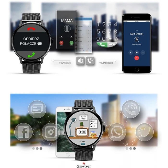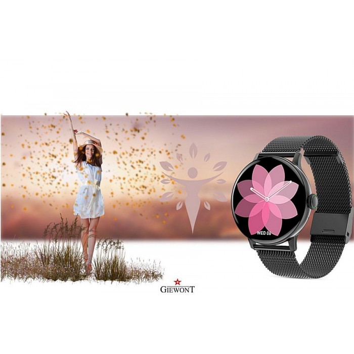 Smartwatch Giewont to zaawansowany technologicznie damski zegarek elektroniczny. Model ten łączy w sobie funkcje wspierające zdrowy styl życia oraz elegancki wygląd. Marka dokłada wszelkich starań, by zaspokoić wymagania i potrzeby osób ceniących sobie funkcjonalność i jakość. Metalowa, okrągła koperta idealnie współgra z silikonowym paskiem w ciemnych tonach. Dzięki dodatkowej bransolecie mesh w czarnym kolorze model ten doskonale sprawdzi się nie tylko jako świetny towarzysz podczas treningu ale również fantastycznie zaprezentuje się jako praktyczny dodatek na co dzień.