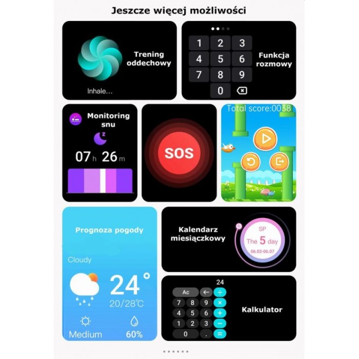 Najważniejsze funkcje to krokomierz, pomiar dystansu, spalonych kalorii, tętna, ciśnienia, natlenienia krwi, termometr. Specjalny kalendarz umożliwi śledzenie cyklu miesiączkowego, co z pewnością docenią Panie. Dzięki funkcji inteligentnego pomiaru rejestrującego fazy snu od lekkiego po głęboki, możesz monitorować i analizować jego jakość. Sprawdź w aplikacji na telefonie dzienny, tygodniowy i miesięczny raport. Dobra jakość snu wpływa pozytywnie na zdrowie i samopoczucie. Sprawdzisz również warunki pogodowe w czasie rzeczywistym i poznasz prognozę na najbliższe dni.