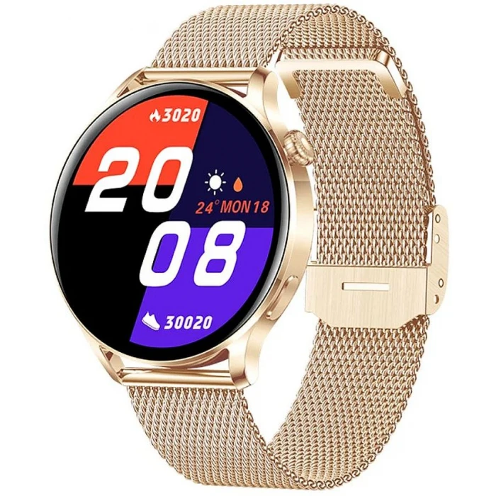 Smartwatch w różowym złoceniu zamknięty w okrągłej kopercie z metalowym przyciskiem z boku, zawieszony na stalowej bransolecie mesh.