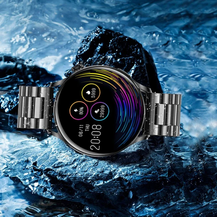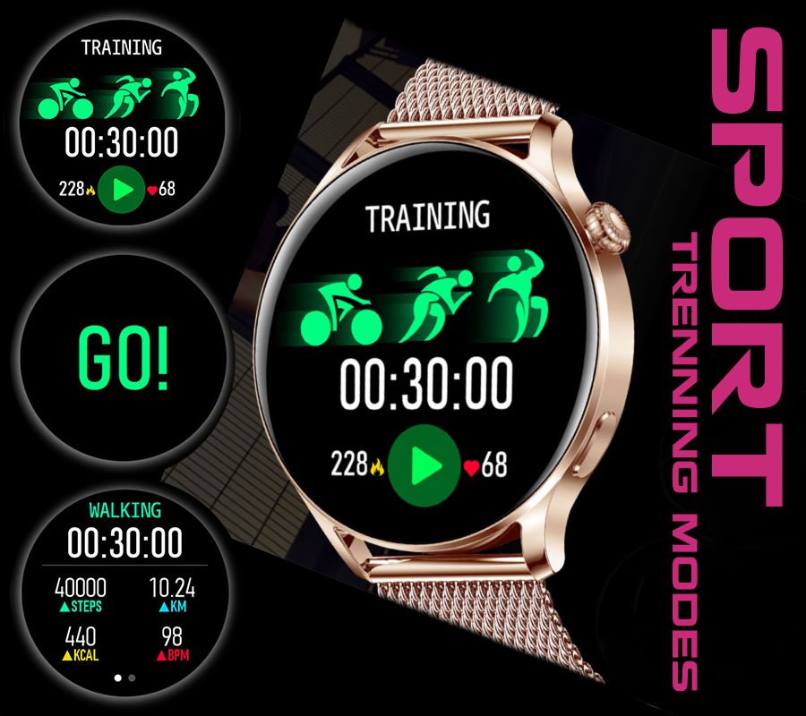 Ten elegancki smartwatch wyposażono w jedną z przydatniejszych funkcji, jaką jest możliwość odbierania i wykonywania połączeń bezpośrednio z czasomierza. To wszystko dzięki wbudowanemu głośnikowi i mikrofonowi, dzięki czemu model doskonale zastępuje zestaw głośnomówiący i pozwala na prowadzenie rozmowy bez konieczności przerywania wykonywanej czynności. Model RNCE81 oferuje nam szereg funkcji propagujących zdrowy styl życia. Doskonałym przykładem jest tu alert przypominający o wypiciu wody, który pomoże nam utrzymać odpowiednie nawodnienie a powiadomienie o bezruchu umożliwi zadbanie o odpowiednią dawkę ruchu w ciągu dnia. Ponad to smartwatch wyposażony jest w rozbudowane tryby sportowe, w których główną rolę pełni monitor pracy serca, licznik spalanych kalorii oraz krokomierz. Po każdorazowym uruchomieniu, a następnie zatrzymaniu trybów treningowych, zegarek przekaże wszystkie dane do aplikacji. Dzięki temu mam możliwość monitorowania postępów w pracy nad kondycją fizyczną. Aktualne dane pogodowe, pozwolą uniknąć zaskoczenia przez deszcz i pozwolą dobrać odpowiedni ubiór do temperatury. Czasomierz jest również precyzyjnie dopracowany pod względem wyglądu. Estetyka i klasa to cechy, którymi wyróżnia się marka. Okrągła koperta oraz stalowa bransoleta mesh idealnie współgrają ze sobą, przez co zegarek pięknie prezentuje się na ręce, uzupełniając każdą stylizację o praktyczny i modny gadżet. Zegarek będzie również idealnym towarzyszem treningów.