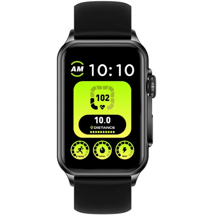 Smartwatch w kolorze czarnym zamknięty w prostokątnej kopercie z przyciskiem z boku, zawieszony na wygodnym, sportowym pasku.