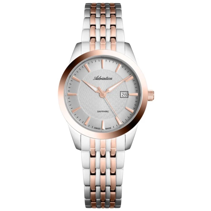 Zegarek ADRIATICA A3188.R117Q to unikatowa propozycja dla kobiet, które poszukują wyjątkowej ozdoby na swój nadgarstek. Model wykonano z bardzo trwałej i odpornej na korozję stali szlachetnej, której nadano kolor modnego różowego złota oraz dystyngowanego srebra. Produkt wyposażono w jasną tarczę z datownikiem i indeksami liniowymi. Całość zabezpiecza szafirowe szkło, cechujące się świetną odpornością na zarysowania. Wodoszczelność produktu plasuje się na poziomie 5 ATM/5 bar, czyli 50 metrów. Można więc nosić go każdego dnia, nie martwiąc się o drobne zachlapania podczas mycia i pielęgnacji dłoni. Zegarek ADRIATICA A3188.R117Q działa dzięki mechanizmowi kwarcowemu Eta F04.