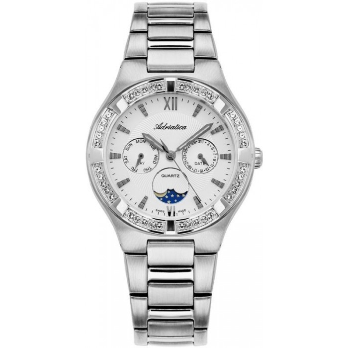 Zegarek damski Adriatica A3421.5163QFZ wyposażony jest w kwarcowy mechanizm RONDA 706. Srebrna tarcza pokryta jest, odpornym na stłuczenia, mineralnym szkiełkiem. Wodoszczelność na poziomie 5 ATM (50m) sprawia, że z zegarkiem można wchodzić do wody, ale nie zaleca się z nim pływać. Stalowa koperta utrzymana jest stalowej bransolecie. Na cyferblacie znajdują się dwie tarcze pełniące funkcję datowników, wskazujących aktualny dzień tygodnia i miesiąca. Ponadto nad godziną 6 znajduje się wskaźnik faz księżyca.