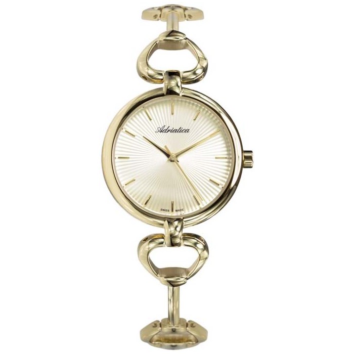 Zegarek ADRIATICA A3463.1111Q wykończony jest w złotej tonacji, dzięki czemu genialnie prezentuje się na damskim nadgarstku. Obok takiego czasomierza żadna kobieta nie przejdzie obojętnie. Jasna tarcza z trzema wskazówkami oraz indeksami liniowymi przykryta jest przez przetestowane szkiełko mineralne, charakteryzujące się wysoką odpornością na stłuczenia. Biżuteryjna bransoleta z bezpiecznym zapięciem oraz okrągła koperta wykonane są z nierdzewnej stali szlachetnej, pokrytej warstwą PVD. Sercem czasomierza jest mechanizm Ronda 763 Swiss Made, odpowiadający za jego sprawne i bezawaryjne działanie. Zegarek ADRIATICA A3463.1111Q ma wodoszczelność klasy 3 ATM, dlatego nie należy zamaczać go w wodzie ani z nim pływać, ale nie straszny mu deszcz lub lekkie zachlapanie.