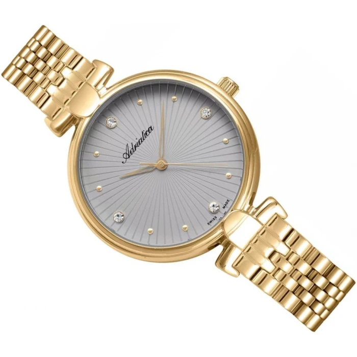 Zegarek damski Adriatica A3530.1147Q to model typu Classic Fashion wyposażony w mechanizm kwarcowy Ronda 763 Swiss Made. Zarówno bransoleta jak i koperta zostały wykonane z najwyższej jakości stali szlachetnej 316L, niealergizującej, oksydowanej w kolorze złotym. Szarą tarczę zdobią promieniste szlify a wśród indeksów precyzyjnie osadzono kryształki Swarovskiego. Nowoczesny i modny model dla Pań ceniących oprócz klasycznej funkcji zegarka biżuteryjne walory.