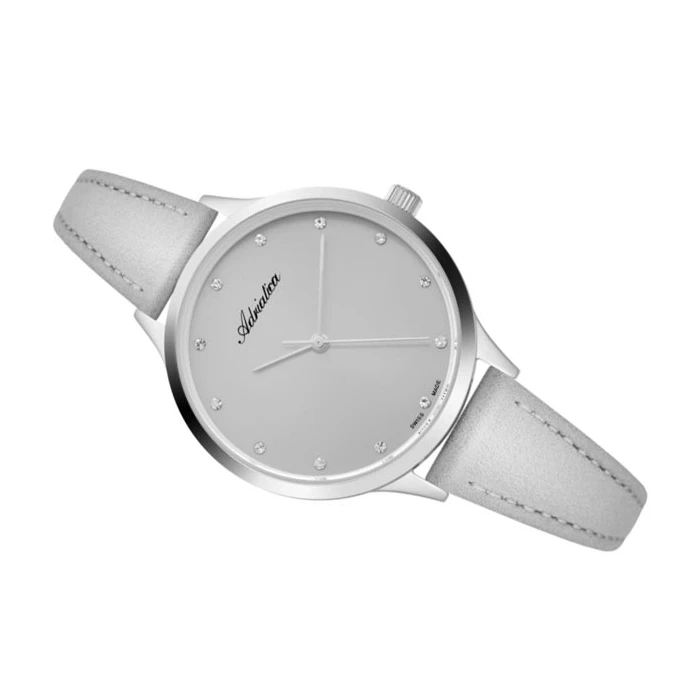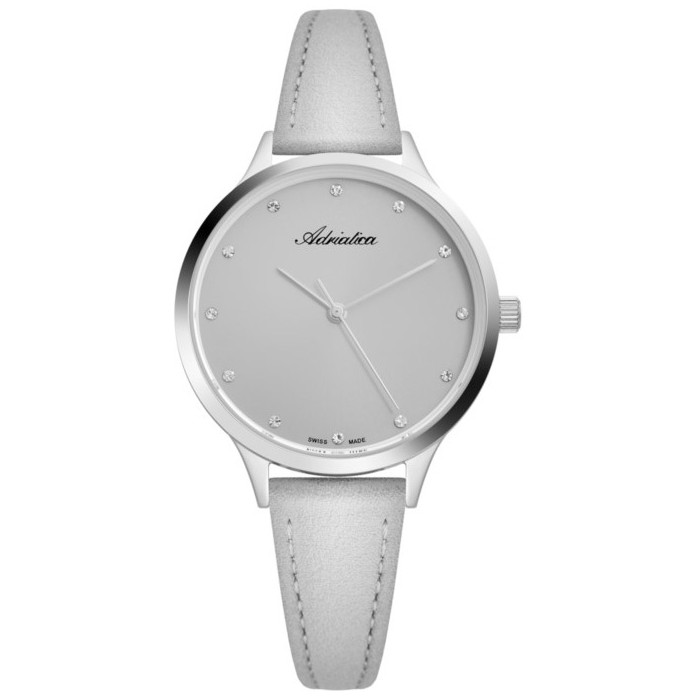 Zegarek ADRIATICA A3572.5G47Q to model dedykowany dla pań, które uwielbiają stylowe rozwiązania. Czasomierz ten doskonale podkreśli zarówno oficjalny ubiór, jak i ten w casualowym wydaniu. Szara tarcza ozdobiona jest srebrnymi kryształkami, które pełnią funkcję indeksów, ułatwiających odczytanie godziny. Całość, wraz ze wskazówkami przykrywa mineralne szkiełko o dobrym poziomie przejrzystości. Analogowy cyferblat otoczono okrągłą kopertą z niezwykle trwałego materiału, czyli stali szlachetnej. Dla wygody użytkowniczek zegarek ADRIATICA A3572.5G47Q umieszczono na skórzanym pasku w kolorze szarości. Produkt ma wodoszczelność na poziomie 3 ATM, co pozwala na swobodne mycie rąk, bez obaw o sporadyczne zachlapania. Za jego niezawodne działanie odpowiada kwarcowy mechanizm Ronda 763.