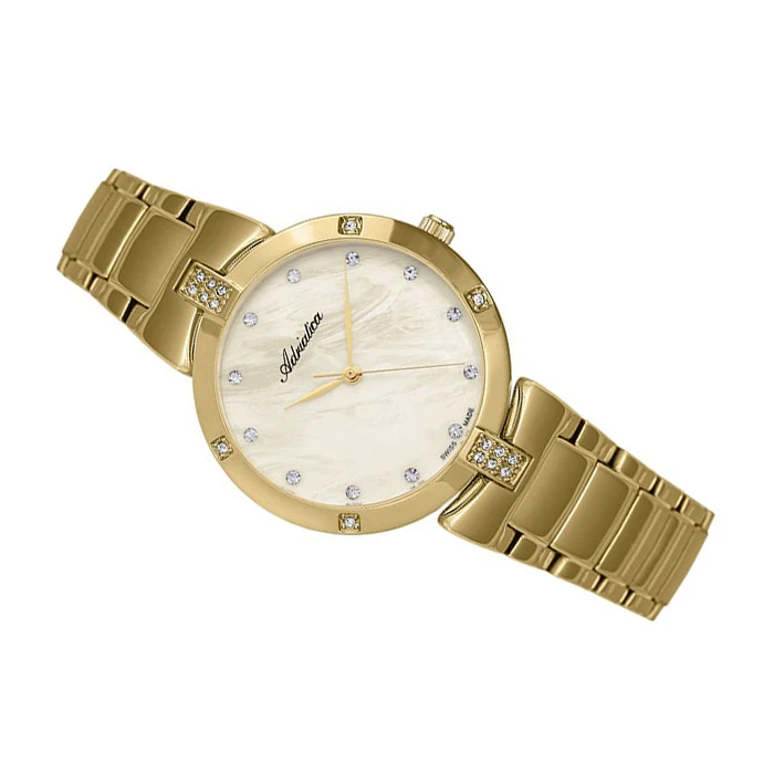 Zegarek ADRIATICA A3696.114SQZ utrzymany jest w dystyngowanym, złotym kolorze. To model z górnej półki, który z pewnością stanie się prawdziwym ulubieńcem eleganckich kobiet. Stylowa koperta ze srebrnymi dodatkami zawieszona jest na solidnej bransolecie. Perłowa tarcza o naturalnym, kremowym odcieniu również wyposażona jest w srebrne cyrkonie, które pełnią funkcję indeksów, ułatwiających szybkie odczytanie godziny. Powierzchnia cyferblatu chroniona jest przed uszkodzeniami przez mineralne szkiełko. Zegarek ADRIATICA A3696.114SQZ działa dzięki wysokiej klasy mechanizmowi Ronda 763, który wyprodukowano w Szwajcarii, czyli kraju słynącym z pasji do najlepszych na świecie czasomierzy.
