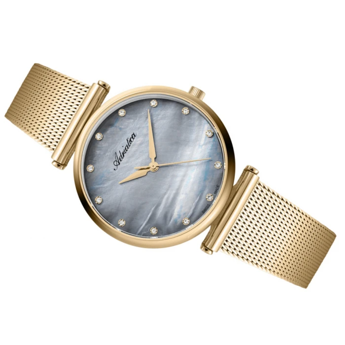 Zegarek ADRIATICA A3712.114ZQ to model, który zachwyca swoim klasycznym wyglądem połączonym z kobiecą subtelnością. Będzie idealnym dodatkiem dla kobiet lubiących wyróżniać się z tłumu za pomocą modnej biżuterii. Okrągła, złota koperta wraz z bransoletą typu mesh w tym samym kolorze została wykonana ze stali szlachetnej, czyli trwałego, nierdzewnego i antyalergicznego surowca. Cyferblat z masy perłowej, na którym umieszczono złote wskazówki i indeksy w formie małych kryształków, pokrywa odporne na zarysowania szkiełko mineralne. Precyzyjny chód zapewnia niezawodny mechanizm kwarcowy Eta F04 Swiss Made wyprodukowany w Szwajcarii. Zegarek ADRIATICA A3712.114ZQ posiada wodoszczelność na poziomie 3 ATM (30 metrów), co pozwala na delikatne zachlapania powstałe podczas mycia lub pielęgnacji dłoni.