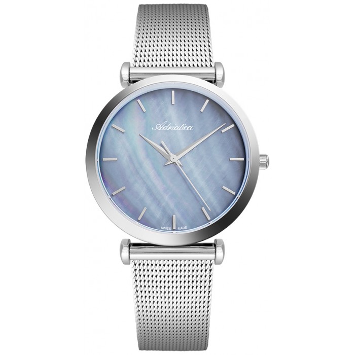 Zegarek ADRIATICA A3713.511ZQ to kobiecy, elegancki model zachwycający swoim uniwersalnym i współczesnym designem. Klasyczną, okrągłą kopertę wypełnia perłowo-błękitna tarcza, która może kojarzyć się nam z niebem lub lekko falującą taflą wody. Srebrna bransoleta typu mesh pięknie dopełnia całość. Wszystkie komponenty tego modelu wykonane zostały z antyalergicznej stali szlachetnej. Zegarek ADRIATICA A3713.511ZQ wyposażony jest w szwajcarski system Eta F04 Swiss Made, charakteryzujący się niebywałą precyzyjnością, a także solidnością. Wodoszczelność na poziomie 3 ATM zabezpiecza przed przypadkowymi zachlapaniami wodą w trakcie mycia rąk. Tarcza została pokryta szkłem mineralnym odpornym na wszelkie zarysowania.