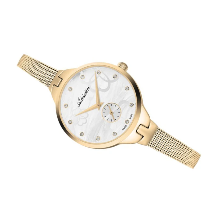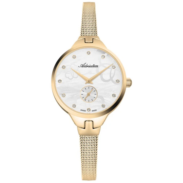 Zegarek ADRIATICA A3719.114FQ to designerski model, który doskonale prezentuje się na nadgarstku. Chętnie sięgają po niego stylowe kobiety, przykładające dużą uwagę do jakości ich ulubionych dodatków. Czasomierz utrzymany jest w kolorze modnego złota, dzięki czemu z pewnością będzie pasował zarówno do oficjalnych, jak i casualowych strojów. Jasna tarcza wysadzana srebrnymi cyrkoniami wzbogacona jest o dodatkowy, mały cyferblat. Całość chroniona jest przed uszkodzeniami dzięki przejrzystemu szkiełku mineralnemu o świetnej odporności na uderzenia. Urządzenie posiada wodoszczelność na poziomie 3 ATM, dzięki czemu można myć z nim ręce, nie martwiąc się o sporadyczne zachlapania. Produkt napędzany jest przez niezawodny mechanizm kwarcowy Eta 902. Zegarek ADRIATICA A3719.114FQ ma dwa lata gwarancji i objęty jest darmową dostawą. Do zamówienia dodajemy także kupon rabatowy na kolejne zakupy w HappyTime, instrukcję obsługi oraz oryginalne opakowanie.