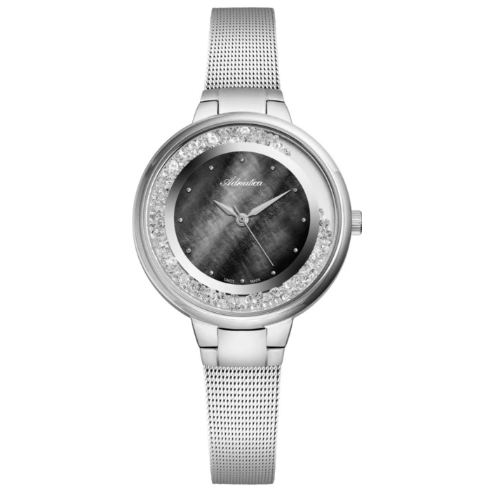 Zegarek ADRIATICA A3720.514MQZ to zjawiskowy model, który jest prawdziwym ulubieńcem kobiet w każdym wieku. To subtelny dodatek, który doskonale uzupełni każdy rodzaj stylizacji, tej wieczorowej lub tej do noszenia na co dzień. Srebrna koperta wraz z bransoletą typu mesh wykonane są z bardzo trwałego materiału, jakim jest stal szlachetna. Cyferblat w kolorze perłowym oraz czarnym pokryty jest szkiełkiem mineralnym, które świetnie sprawdza się jako zabezpieczenie tarczy. Zegarek ADRIATICA A3720.514MQZ napędzany jest przez niezawodny, szwajcarski mechanizm kwarcowy Ronda 785. Jego wodoszczelność plasuje się na poziomie 3 ATM, czyli 30 metrów. Jest on więc odporny na lekkie zachlapania powstałe podczas mycia lub pielęgnacji dłoni.