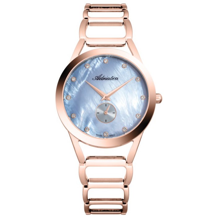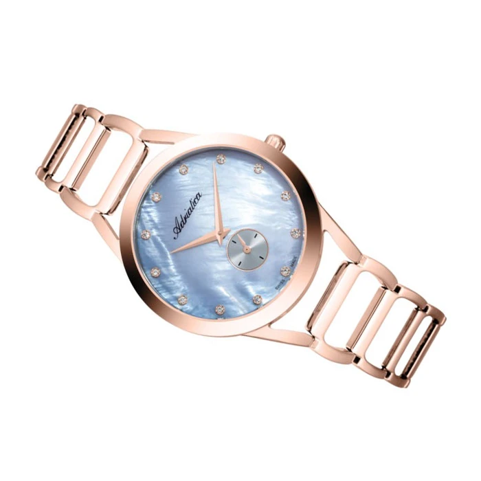 Zegarek ADRIATICA A3725.914ZQ to absolutnie zjawiskowy model, który przyciąga spojrzenia. Jeśli poszukujesz oryginalnego i ponadczasowego urządzenia, oto czasomierz stworzony właśnie dla Ciebie. Urok tego zegarka tkwi w detalach. Producent, już na etapie projektowania zadbał o każdy, nawet najmniejszy szczegół. Produkt wyposażono w piękną, błękitną tarczę z indeksami w formie kryształków. Całość przykrywa wysokiej jakości, mineralne szkiełko. Koperta i bransoleta w najmodniejszym kolorze RoseGold wykonane są ze stali szlachetnej, czyli sprawdzonego materiału, którzy stosują najlepsi producenci. Zegarek ADRIATICA A3725.914ZQ napędzany jest dzięki mechanizmowi Eta 902. Klasa wodoszczelności czasomierza pozwala na lekkie, sporadyczne zachlapania i wynosi ona 30 metrów, czyli 3 ATM.