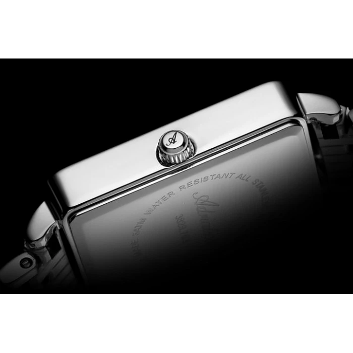 Ten wyjątkowy model wyróżnia się prostokątną kopertą o delikatnie zaokrąglonych krawędziach, wykonaną ze stali szlachetnej w srebrnym kolorze, co nadaje mu biżuteryjny charakter. Srebrna bransoleta doskonale komponuje się z minimalistyczną, z czarną tarczą, która mieni się w świetle dzięki metalizowanemu wykończeniu.