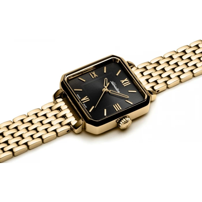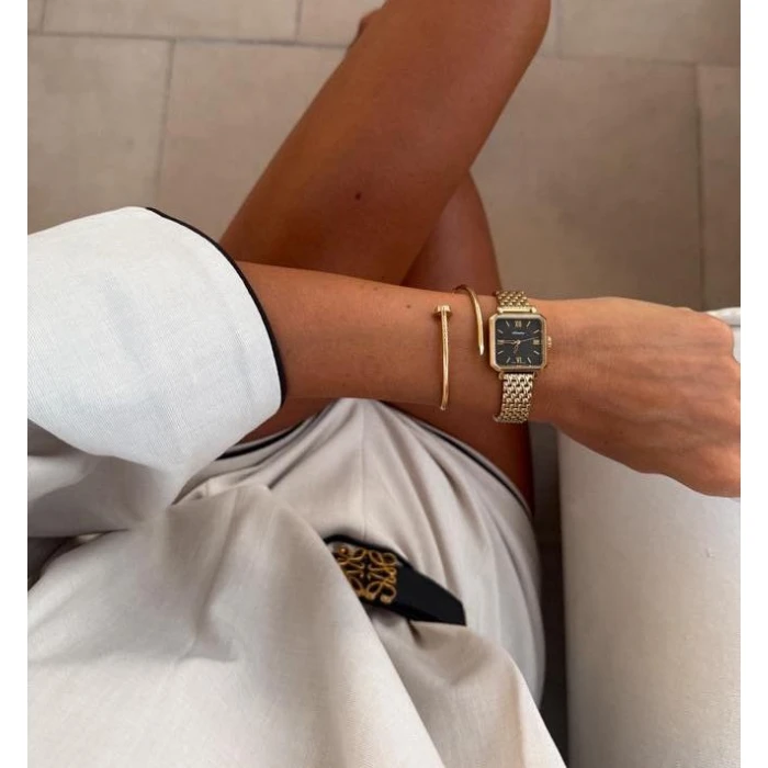 Ten wyjątkowy model wyróżnia się małą, kwadratową kopertą o delikatnie zaokrąglonych krawędziach, wykonaną ze stali szlachetnej w złotym odcieniu, co nadaje mu biżuteryjny charakter. Bransoleta doskonale komponuje się z minimalistyczną, czarną tarczą, która mieni się w świetle dzięki metalizowanemu wykończeniu.