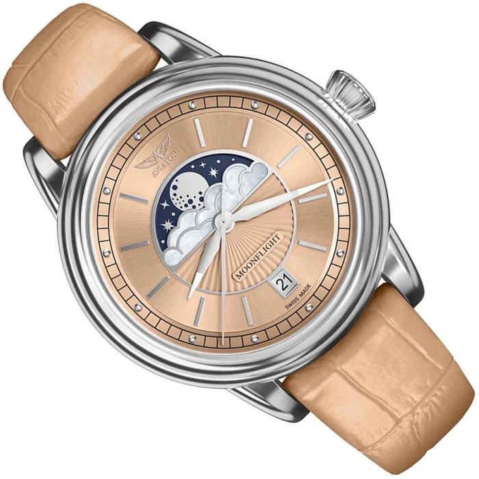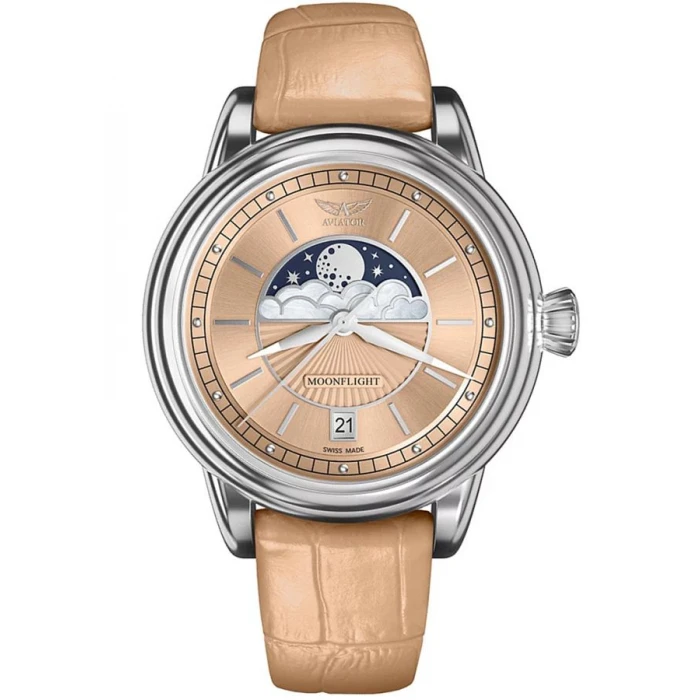 AVIATOR V.1.33.0.259.4 to elegancki model w kobiecej stylistyce inspirowany legendarnym samolotem pasażerskim Douglas DC-3. Czasomierz wyposażono w precyzyjny, szwajcarski mechanizm kwarcowy Ronda 708 13 kamieni, gdzie rezerwa chodu wynosi około 54 miesiące. Koperta o obłych bokach wykonana została z hipoalergicznej, odpornej na zarysowania oraz korozję stali szlachetnej w srebrnym kolorze. Elementem przykuwającym wzrok jest bogata w detale beżowa tarcza. Na jej krawędzi umieszczono skalę minutową w formie torowiska z nakładanymi srebrnymi indeksami. Kolejna część wykończona została szlifem słonecznym a na jej powierzchni znajdują się podłużne, nakładane indeksy godzinowe. Centralna część cyferblatu dzieli się na dwie połowy, co daje efekt do złudzenia przypominający lotniczy przyrząd żyroskopowy tzw, sztuczny horyzont. Dolna część jest giloszowana we wzór znany jako "płomienne promienie chwały" z kolei na górnej umieszczono elementy stylizowane na chmury i wypełniono je prawdziwą masą perłową. Ponad nimi zaś, na ruchomej tarczy widnieje księżyc z gwiazdami wskazujący fazę, w której aktualnie znajduje się srebrny glob. Czasomierz zabezpieczono lekko wypukłym, anty-refleksyjnym szkiełkiem szafirowym, które dzięki swojej twardości doskonale chroni cyferblat.