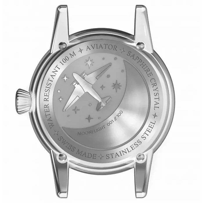 Zegarek AVIATOR V.1.33.0.259.4 wyposażono w analogowe wskazanie czasu, co sprawia, że odczyt jest prosty i intuicyjny. Eleganckie wskazówki w stylu dauphine doskonale komponują się z jasną barwą tarczy. Dodatkowo końcówki pokryto masą luminescencyjną Super-lumiNova, co umożliwia odczyt w ciemności. Na godzinie szóstej widnieje gustowne okienko datownika, wskazujące aktualny dzień miesiąca. Warto zwrócić uwagę na pełny dekiel, który jest lekko wklęsły. Na jego powierzchni umieszczono wizerunek samolotu Douglas DC-3 na tle rozgwieżdżonego nieba oraz podstawowe informacje o zegarku. Całości dopełnia nakładane logo marki umieszczone na godzinie dwunastej.