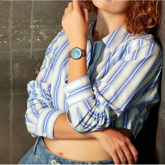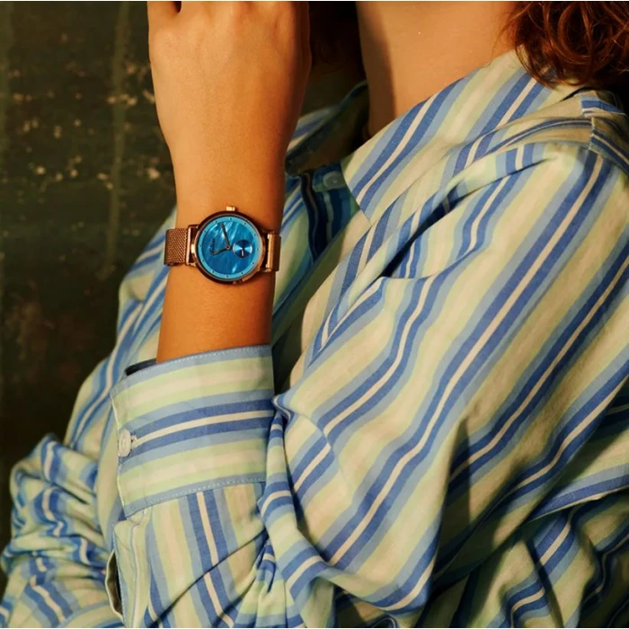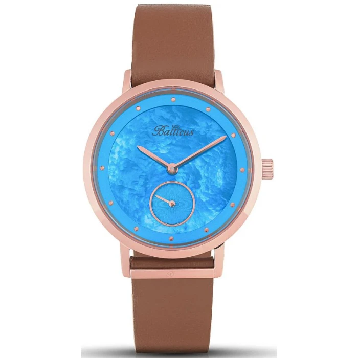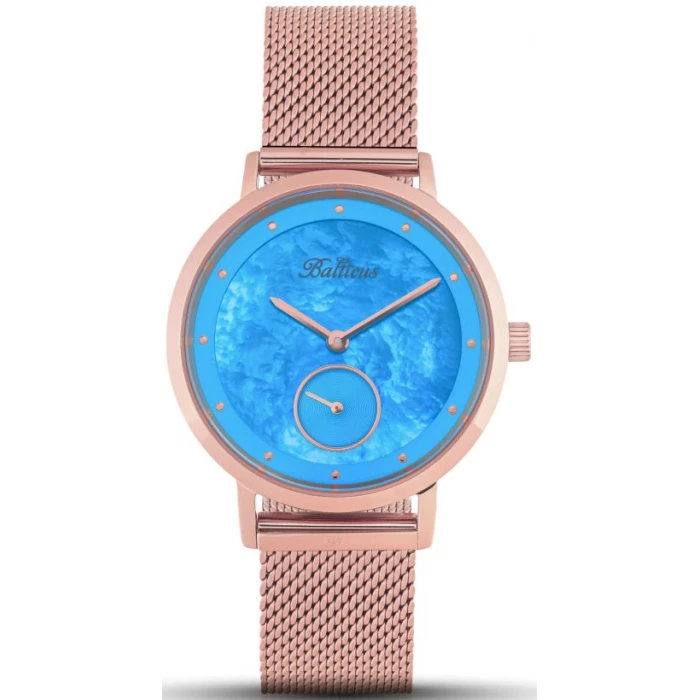 Zegarek BLT-BALNSRBL z kolekcji Sky polskiego producenta Balticus to elegancka propozycja na każdą okazję. Jego różowo-złota tonacja oraz tarcza z perłowej masy w subtelnym, niebieskim odcieniu przyciągają wzrok. Naturalne wzory na tarczy sprawiają, że każdy egzemplarz jest unikalny. Mała tarcza z sekundnikiem dodaje zegarkowi precyzji i charakteru. To połączenie stylu i funkcjonalności w jednym.