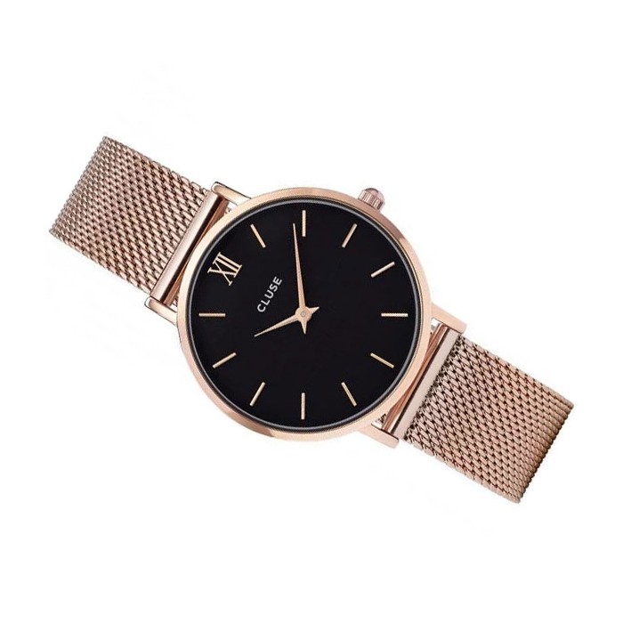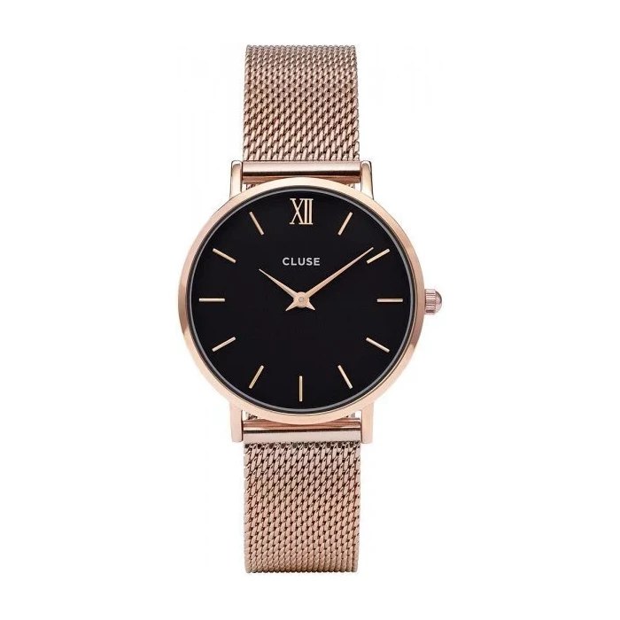 Zegarek CLUSE Minuit CW0101203003 to model o wyrazistym designie, który został zaprojektowany z myślą o wyjątkowych kobietach. Będzie świetnym wyborem dla fanek stylowych dodatków, obok których nikt nie przejdzie obojętnie. Czasomierz utrzymany jest na bransolecie typu mesh, która wykonana jest z wysokiej jakości stali szlachetnej, pokrytej dodatkowo powłoką PVD w kolorze różowego złota. Okrągła koperta chroni mechanizm kwarcowy przed uszkodzeniami. Wyrazista, czarna tarcza z indeksami liniowymi, logo producenta oraz wskazówkami w kolorze różowego złota przykryta jest szkiełkiem mineralnym, które jest odporne na uszkodzenia i typowe dla zegarków zarysowania. Zegarek charakteryzuje się wodoszczelnością na poziomie 3 ATM, czyli 30 metrów. Oznacza to, że nie wykazuje on wrażliwości na lekkie zachlapania, ale nie należy zanurzać go w wodzie.