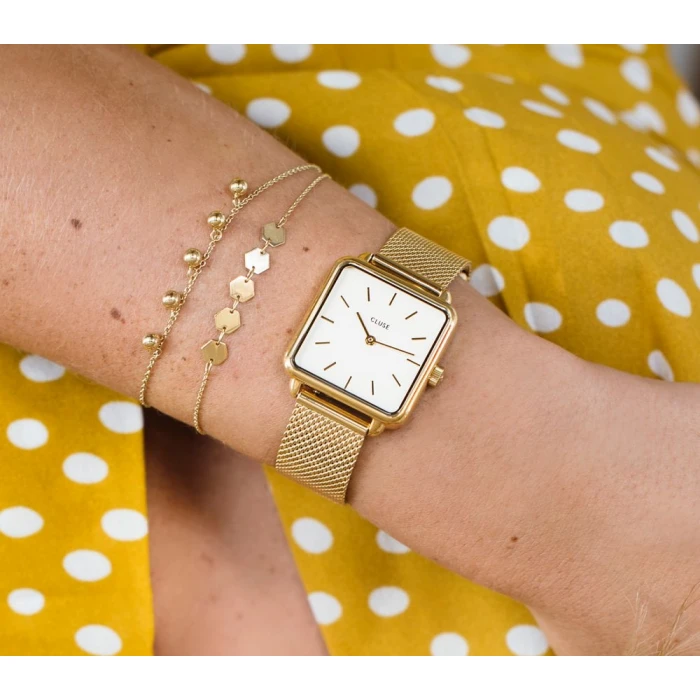 Zegarek CLUSE La Tétragone Gold CW0101207002 to wyjątkowy model, który pokochają wszystkie stylowe kobiety. Świetnie prezentuje się na damskim nadgarstku, dodając noszącej go osobie wyjątkowego charakteru. Będzie świetnym dodatkiem do strojów w casualowym stylu, ale także klasycznym. Biała, minimalistyczna tarcza wzbogacona jest o dwie wskazówki, liniowe indeksy oraz logo holenderskiego producenta. Przykrywa ją szkiełko mineralne, które dzięki swoim właściwościom chroni cyferblat przed zarysowaniami. Całość wpisana jest w kształt zaoblonego kwadratu. Stalowa koperta pokryta jest powłoką PVD w kolorze pięknego złota. Korpus czasomierza utrzymano na solidnej bransolecie typu mesh. Zegarek CLUSE La Tétragone Gold CW0101207002 ma wodoszczelność na poziomie 3 ATM. Działa w oparciu o bezawaryjny, wysokiej klasy mechanizm kwarcowy.