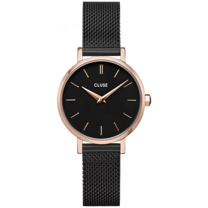 Zegarek CLUSE La Bohème Petite CW0101211004 to jeden z najpiękniejszych modeli z tej kolekcji. Wykończony w odcieniach czerni i różowego złota damski czasomierz świetnie sprawdzi się na nadgarstku każdej stylowej kobiety. Na minimalistycznej tarczy znajdują się logo producenta, dwie wskazówki oraz liniowe indeksy, które ułatwiają odczytanie godziny. Wokół niej znajduje się koperta wykonana ze stali szlachetnej. Cyferblat przykrywa szkiełko mineralne, które jest chętnie stosowane przez producentów zegarków, dzięki swoim doskonałym właściwościom, takim jak odporność na uszkodzenia czy zarysowania. Model z kolekcji La Bohème Petite utrzymany jest na najmodniejszej w 2021 roku bransolecie typu mesh. Zegarek Cluse La Bohème Petite CW0101211004 ma wodoszczelność klasy 5 ATM, czyli 50 metrów.