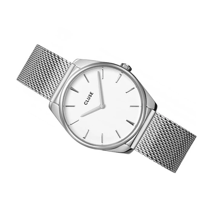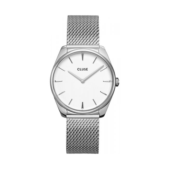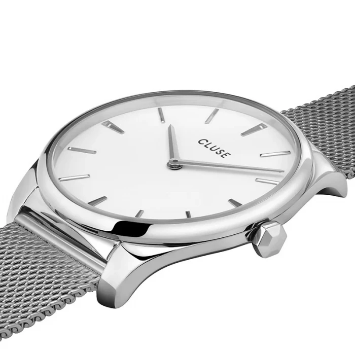 Zegarek CLUSE Féroce CW0101212001 to jeden z najbardziej klasycznych modeli od tego producenta. Doceniany przez stylowe kobiety czasomierz, świetnie sprawdza się na damskim nadgarstku, dzięki swojej minimalistycznej stylistyce. Zegarek od holenderskiej marki CLUSE utrzymany jest w kolorze srebra i bieli. Wygodna bransoleta typu mesh świetnie koresponduje z białym cyferblatem na którym znajdują się logo producenta, indeksy liniowe, oraz wskazówki. Całość przykrywa szkiełko mineralne o doskonałej odporności na uderzenia lub zarysowania. Wodoszczelność tego modelu plasuje się na skali 5 ATM, co daje pewność, że można myć z nim ręce bez obaw o zachlapania.