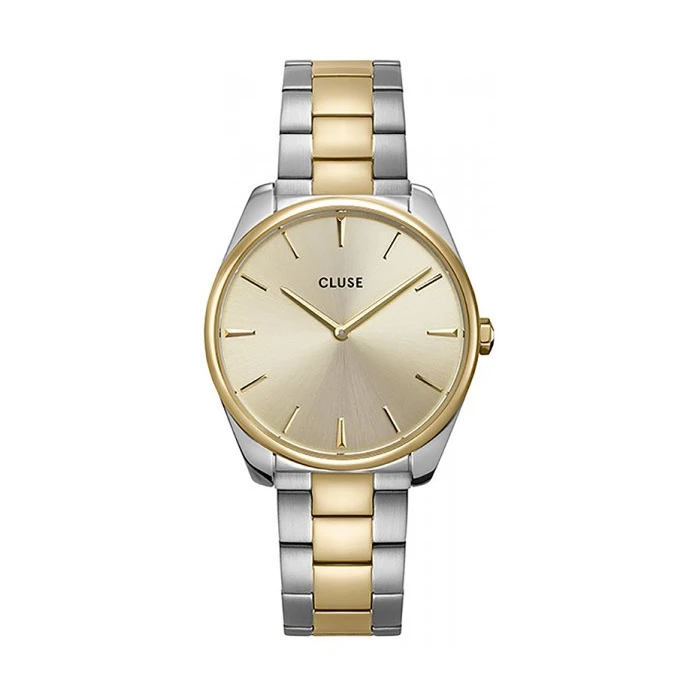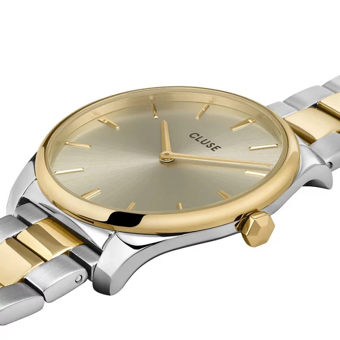 Zegarek CLUSE Féroce CW0101212004 urzeka swoim wyjątkowym designem. Przypadnie on do gustu każdej kobiecie, która docenia minimalizm i harmonię, jeśli chodzi o wybór dodatków i biżuterii. Będzie świetnym uzupełnieniem damskiej garderoby, po który chętnie będziesz sięgać każdego dnia. Holenderski producent zegarków CLUSE w swoich projektach stawia na najmodniejsze wzory, dlatego sprawdzi się on zarówno do ubioru w stylu oficjalnym, ale także casualowym. Model ten utrzymany jest na solidnej bransolecie w odcieniach srebra i złota, która wykonana jest z wysokiej jakości stali szlachetnej. Złota, przyciągająca wzrok tarcza zabezpieczona jest szkiełkiem mineralnym o wysokiej odporności na uderzenia. Zegarek CLUSE Féroce CW0101212004 działa w oparciu o dopracowany i precyzyjny mechanizm kwarcowy. Jego wodoszczelność wynosi 5 ATM, dzięki czemu czasomierz odporny jest na zachlapania czy deszcz.