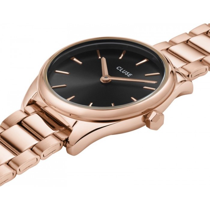 Zegarek Cluse Féroce Mini CW11703 to elegancki damski czasomierz, który sprawdzi się jako dodatek na każdą okazję. Dominujący w tym przypadku kolor różowego złota przywodzi na myśl prawdziwy luksus. Na czarnym cyferblacie umieszczono złote indeksy w formie linii, a całość zabezpiecza wysokogatunkowe szkiełko mineralne, charakteryzujące się odpornością na stłuczenia. Bransoletę wraz z kopertą zrobiono z jednego z najtrwalszych materiałów dostępnych na rynku, czyli stali szlachetnej. Dodatkowo jest to surowiec antyalergiczny i nierdzewny, co podnosi komfort jego użytkowania. Zegarek Cluse Féroce Mini CW11703 napędza niezawodny i precyzyjny mechanizm kwarcowy Seiko Epson Y120F1. Wodoszczelność na poziomie 3 ATM pozwala na sporadyczny kontakt z wodą, np. podczas mycia dłoni.