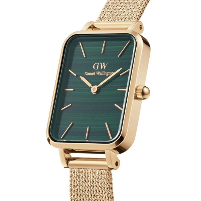 DW00100561 wykonany został w całości ze stali szlachetnej 316L, złoconej trwałą metodą PVD odporną na wycieranie. Elegancka, minimalistyczna tarcza w szmaragdowym kolorze pokryta została szkiełkiem mineralnym. Czasomierz odznacza się wodoszczelnością klasy 3 ATM, co oznacza, że jest on odporny na drobne zachlapania. Atutem jest grubość koperty - tylko 6mm! Dodatkową zaletą jest stylowa bransoleta typu mesh, która idealnie dopasuje się do nadgarstka a zapięcie suwakowe pozwoli na samodzielne dostosowanie długości bransolety do obwodu ręki.