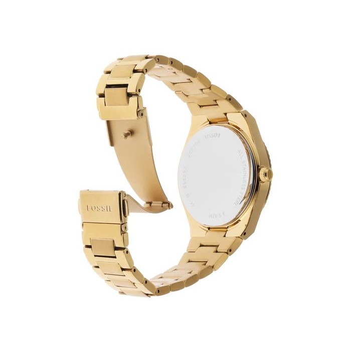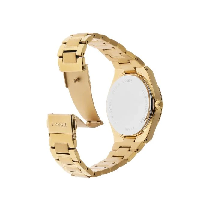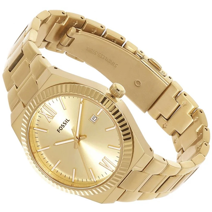 Elegancki damski zegarek ES5299 Scarlette  znanej i cenionej amerykańskiej marki FOSSIL. Wyjątkowa stylistyka utrzymana jest w złotej tonacji. Wyposażony został w kwarcowy mechanizm zasilany baterią. Koperta z charakterystycznymi żłobieniami wykonana została z hipoalergicznej stali szlachetnej, o podwyższonej odporności na warunki atmosferyczne oraz ścieranie. Całość zawieszono na stalowej bransolecie w tej samej barwie. Tarcza została nakryta przez odporne na stłuczenia mineralne szkiełko. Atutem jest praktyczny datownik przy godzinie 3-ej wskazujący aktualny dzień miesiąca. Wodoszczelność na poziomie 5 atm to odporność na drobne zachlapania np. podczas mycia rąk oraz krótkotrwałe zanurzenie w wodzie. Ten efektowny zegarek przypadnie do gustu osobom ceniącym sobie jakość, modne dodatki oraz precyzję wykonania.