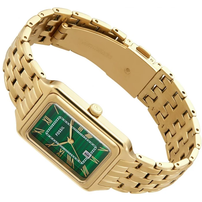 Fossil ES5341 to elegancki zegarek damski z wyróżniającą prostokątną kopertą, zieloną tarczą oraz zintegrowaną siedmio-rzędową bransoletą.