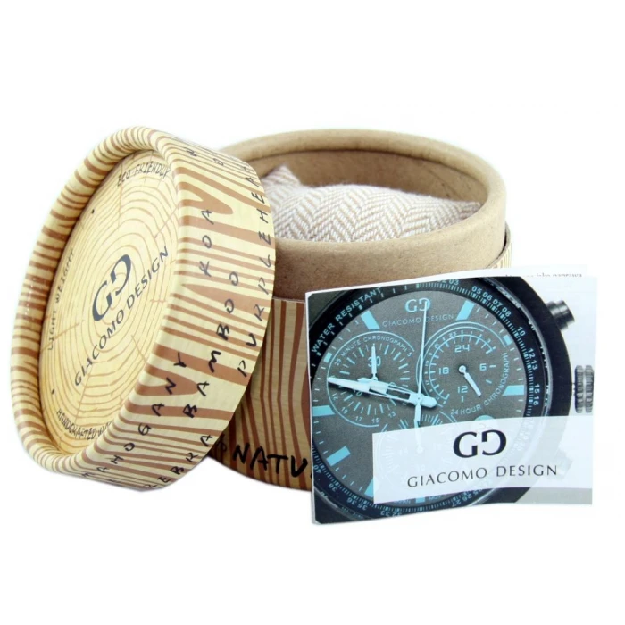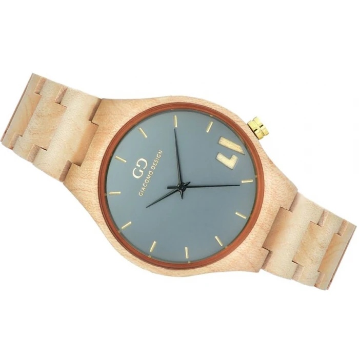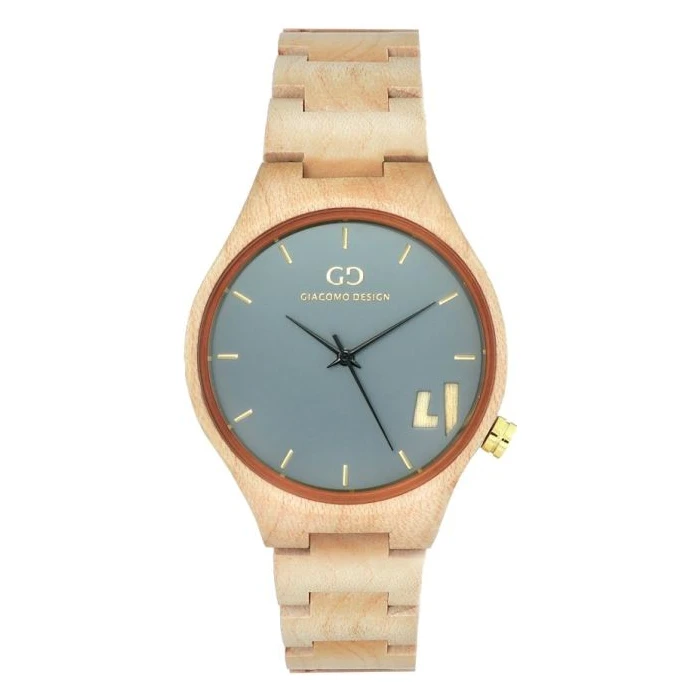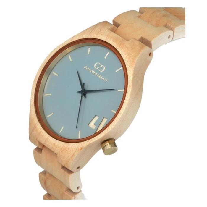 Zegarek damski Giacomo Design Eccezionali Quattro GD08402 napędzany jest za pomocą mechanizmu kwarcowego. Zarówno koperta jak i bransoleta zostały wykonane  z drewna klonowego, natomiast szarą tarczę osłania szkiełko mineralne. Przy godzinie 4 wyrzeźbiona jest designerska "czwórka".