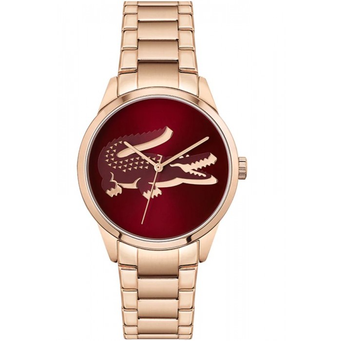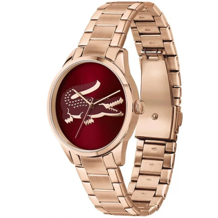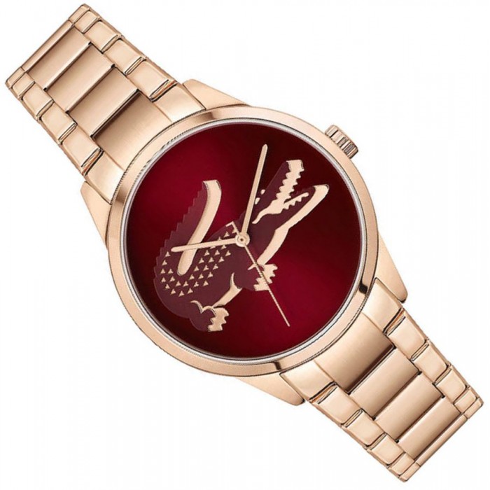 Lacoste 2001191 to przykuwający wzrok model w klasycznym stylu. Wyposażony został w precyzyjny mechanizm kwarcowy, zasilany baterią o średniej żywotności około 2 lat. Koperta wykonana została z hipoalergicznej, odpornej na zarysowania oraz korozję stali szlachetnej, pokrytej powłoką w technologii PVD w kolorze różowego złota. Czasomierz zawieszono na delikatnej trzyrzędowej bransolecie. Zapięcie motylkowe, które zastosowano w czasomierzu pozwala na szybkie zakładanie i zdejmowanie zegarka, przy czym mechanizm nie zezwala na samoistne odpinanie się bransolety. Okrągła tarcza w bordowym kolorze ozdobiona została wypukłym logo marki w centralnej części i zabezpieczona szkiełkiem mineralnym, które dzięki swojej elastyczności i wytrzymałości doskonale chroni przed zarysowaniem.