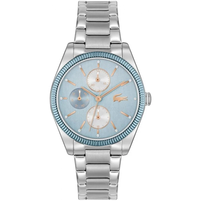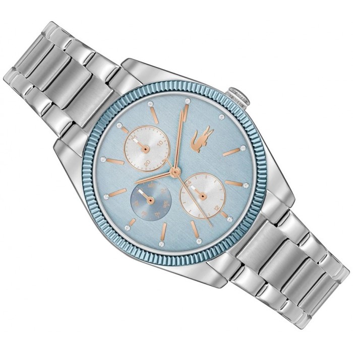 Lacoste 2001365 z błękitną tarczą i błyszczącymi kryształkami nad indeksami to elegancki i modny zegarek damski z kolekcji Orsay francuskiego producenta.