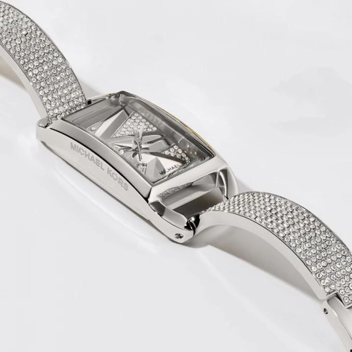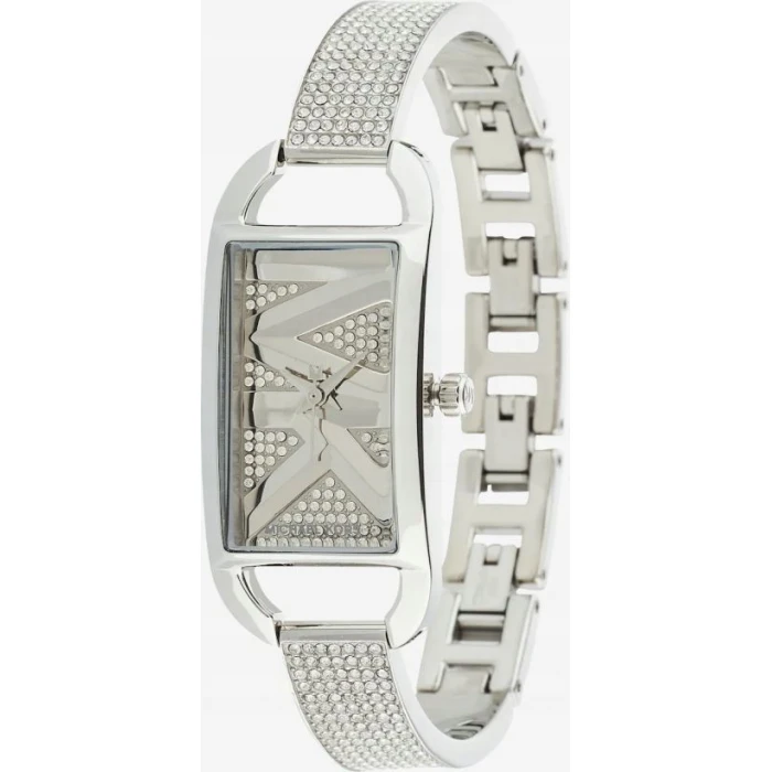 Zegarek amerykańskiej marki MICHAEL KORS MK4841 z kolekcji Empire z wytworną, prostokątną kopertą, tarczą z dużym z logo producenta i srebrnymi kryształkami na eleganckiej, biżuteryjnej bransolecie w srebrnym kolorze.