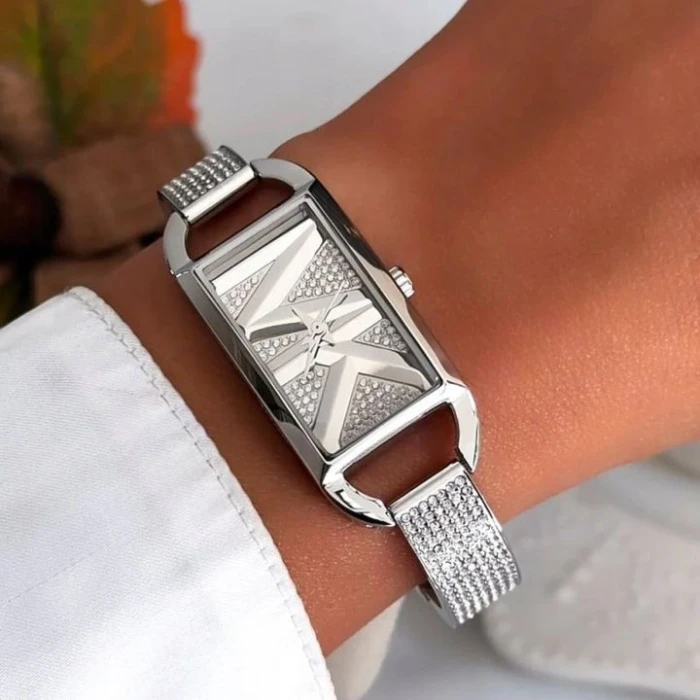 Elegancki, biżuteryjny zegarek damski z prostokątną kopertą.