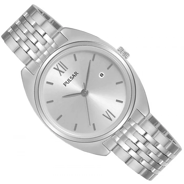 Zegarek PULSAR PH7555X1 wyposażono w analogowe wskazanie czasu, dzięki temu odczyt jest prosty i intuicyjny. Wskazówki oraz indeksy w formie cyfr rzymskich doskonale komponują się z barwą czasomierza. Na godzinie trzeciej umieszczono niewielkie, okrągłe okienko datownika, wskazujące aktualny dzień miesiąca. Gustowna bransoleta o drobnych ogniwach dodaje zegarkowi lekkości i delikatności a całość fantastycznie prezentuje się na ręce. Prosty styl czasomierza sprawia, że jest on eleganckim i funkcjonalnym dodatkiem.