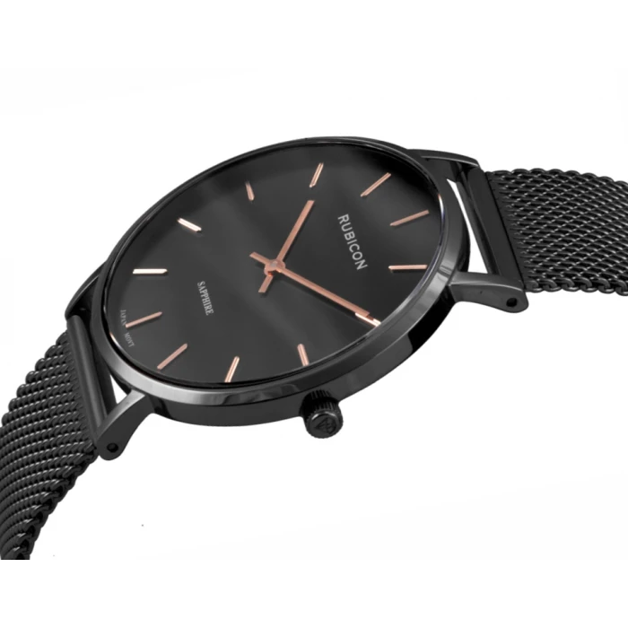 Zegarek damski RUBICON RBN153 to połączenie ponadczasowej klasyki oraz nowoczesnego stylu. Zarówno koperta jak i bransoleta zostały wykonane ze stali szlachetnej 316L oksydowanej na czarno. Elegancka, czarna tarcza pokryta jest trwałym szkiełkiem szafirowym. Dodatkową zaletą jest bransoleta typu mesh, która idealnie dopasuje się do kobiecego nadgarstka a zapięcie suwakowe pozwoli na samodzielne dostosowanie długości bransolety do obwodu ręki.