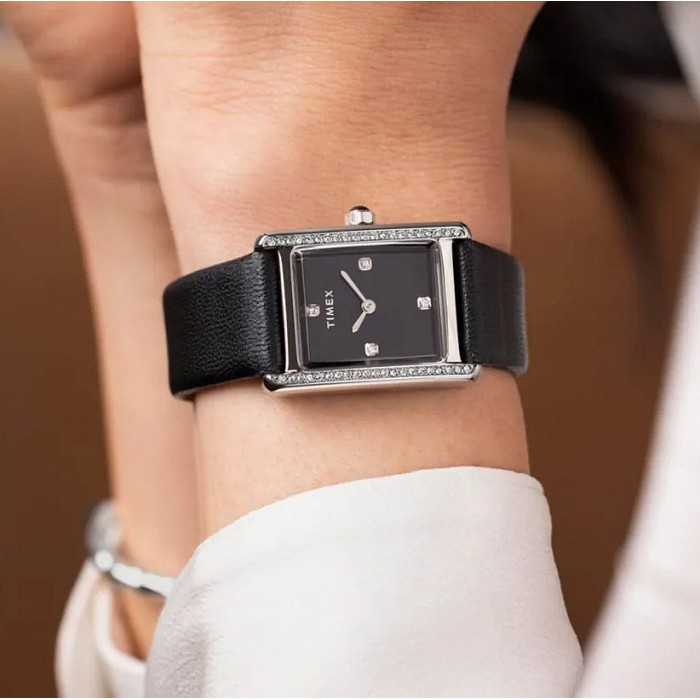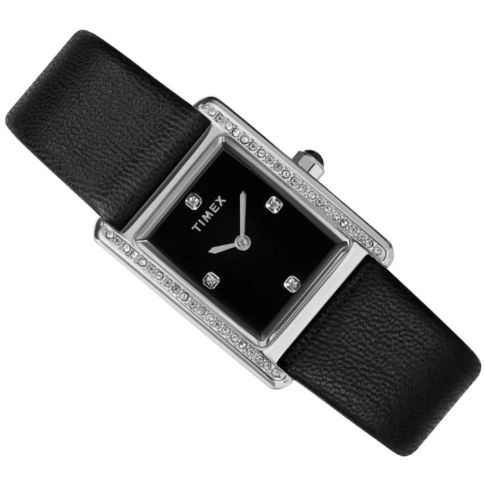 Zegarek damski Timex TW2W63800 to elegancki model z kolekcji Hailey, który łączy subtelny, wyrafinowany styl z nowoczesnym designem. Idealny dla kobiet ceniących minimalistyczne, ale luksusowe dodatki, ten czasomierz wyróżnia się prostokątną kopertą zdobioną kryształami i i czarną tarczą, która podkreśla jego ponadczasową elegancję. Czarny pasek z wegańskiej skóry łączy klasyczny styl z ekologicznym podejściem. To doskonały wybór na codzienne stylizacje i specjalne okazje, odzwierciedlający tradycję marki Timex, założonej w 1854 roku.