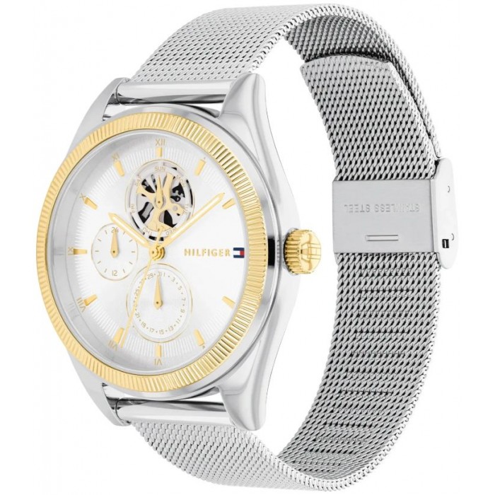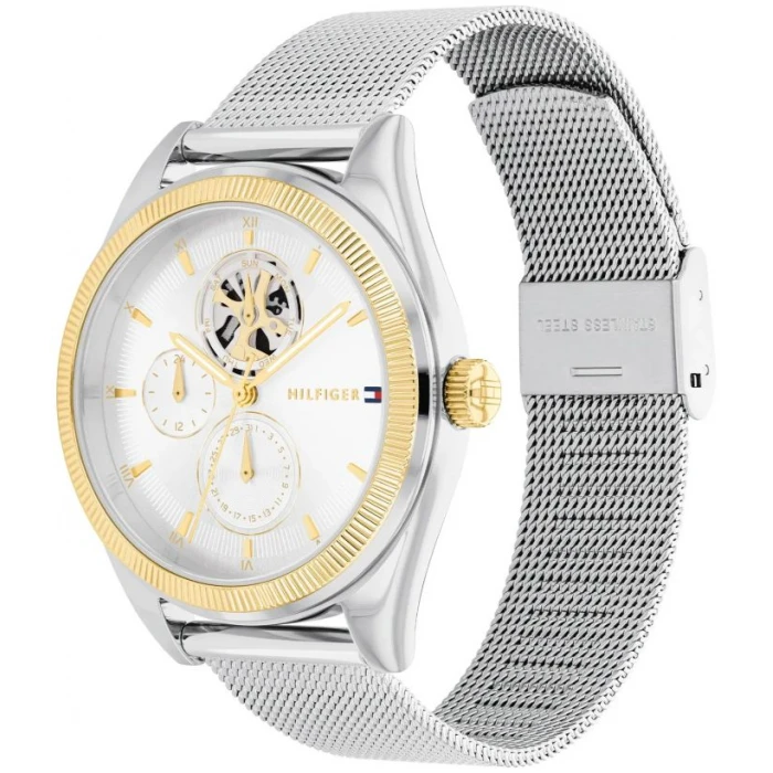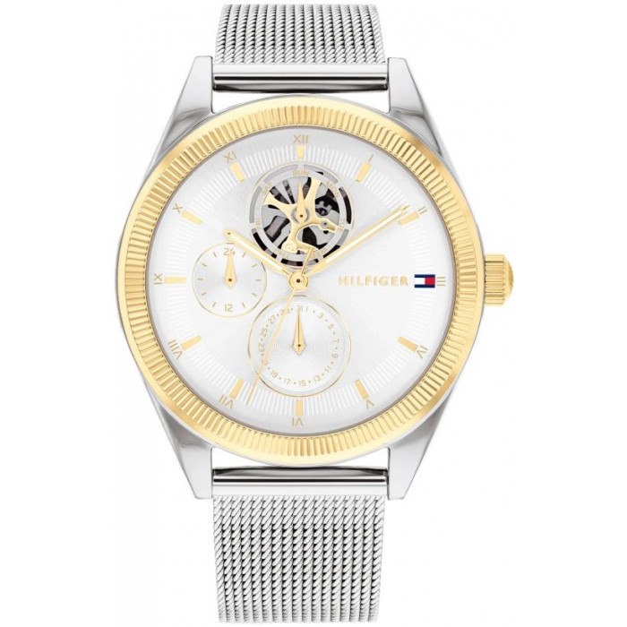 Zegarek damski TOMMY HILFIGER 1782713 to modny czasomierz znanej amerykańskiej marki. Wyjątkowa stylistyka zegarka utrzymana została w srebrnej i złotej tonacji. Uwagę zwraca częściowo odkryty mechanizm na tarczy oraz stylowe logo TH przy godzinie 3-ej.