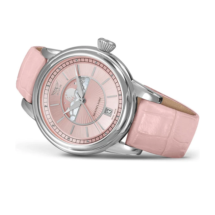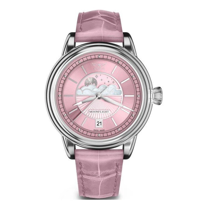 Zegarek damski AVIATOR DOUGLAS MOONFLIGHT V.1.33.0.257.4 dedykowany jest dla kobiet, które przy wyborze zegarka stawiają na jego wyjątkowość. Czasomierz marki AVIATOR w odcieniu różowym doskonale podkreśli modny look, będąc świetnym uzupełnieniem codziennej garderoby. Został on zaprojektowany na cześć amerykańskiego samolotu pasażerskiego Douglas DC-3. Był to jeden z najpopularniejszych samolotów lat 30. i 40. XX wieku. Został okrzyknięty jednym z najbardziej znaczących samolotów w dziejach lotnictwa. Różowy zegarek damski swoją wyjątkowość zawdzięcza dopracowanej tarczy w stylu art-deco. Znalazł się na niej wskaźnik faz księżyca i datownik, który pokazuje odpowiedni dzień miesiąca. Całość utrzymana jest na pasku skórzanym, również w odcieniu różu. Koperta wykonana jest ze stali, która dzięki swoim właściwościom nie rdzewieje. Zegarek AVIATOR DOUGLAS MOONFLIGHT V.1.33.0.257.4 odznacza się wodoszczelnością na poziomie 10 ATM. Działa on w oparciu o kwarcowy mechanizm szwajcarski Ronda 708. Tarczę zabezpiecza szkiełko szafirowe, które jest oporne na zarysowania.