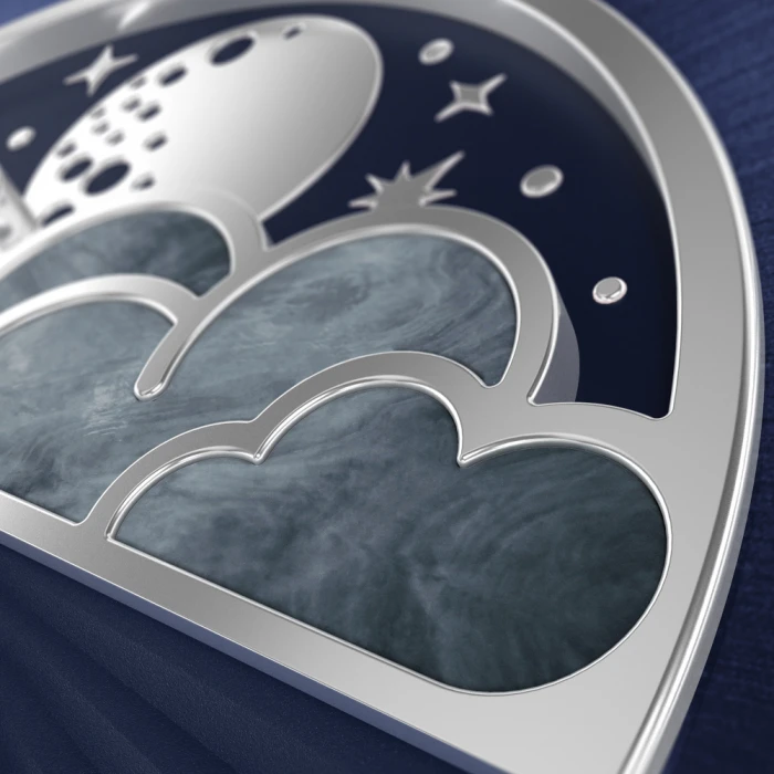 - Funkcje: Datownik dni miesiąca na godzinie 6 oraz wskaźnik faz księżyca, prezentujący 29,5-dniowy cykl księżycowy w artystycznej formie.