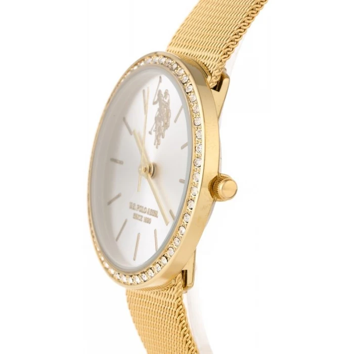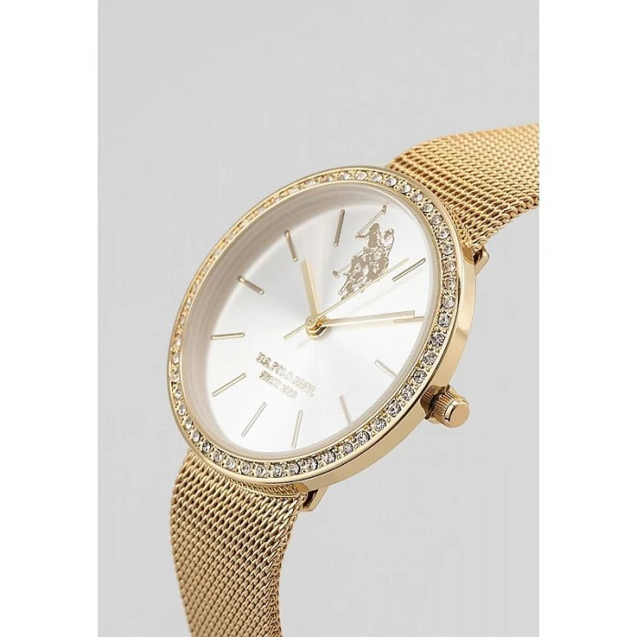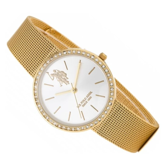 Zegarek U.S. Polo Assn. USP5672YG zachwyca wyrafinowanym designem z subtelnym sportowym akcentem, inspirowanym dziedzictwem sportu polo. Srebrna tarcza z delikatnym połyskiem Sunray, ozdobiona kryształkami na lunecie, kontrastuje z polerowaną, żółto-złotą kopertą i bransoletą typu mesh, tworząc luksusowy i wszechstronny wygląd. Koperta o średnicy 32 mm jest idealnie dopasowana do kobiecego nadgarstka, zapewniając komfort i elegancję. Lekka bransoleta mesh z zapięciem G-link gwarantuje wygodę i nowoczesny styl. Logo U.S. Polo Assn. na tarczy podkreśla autentyczność i klasę marki, czyniąc ten model idealnym dla kobiet, które chcą wyróżnić się stylem na co dzień lub podczas specjalnych okazji.