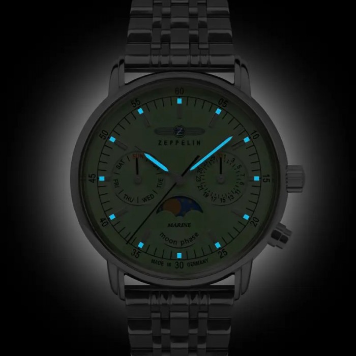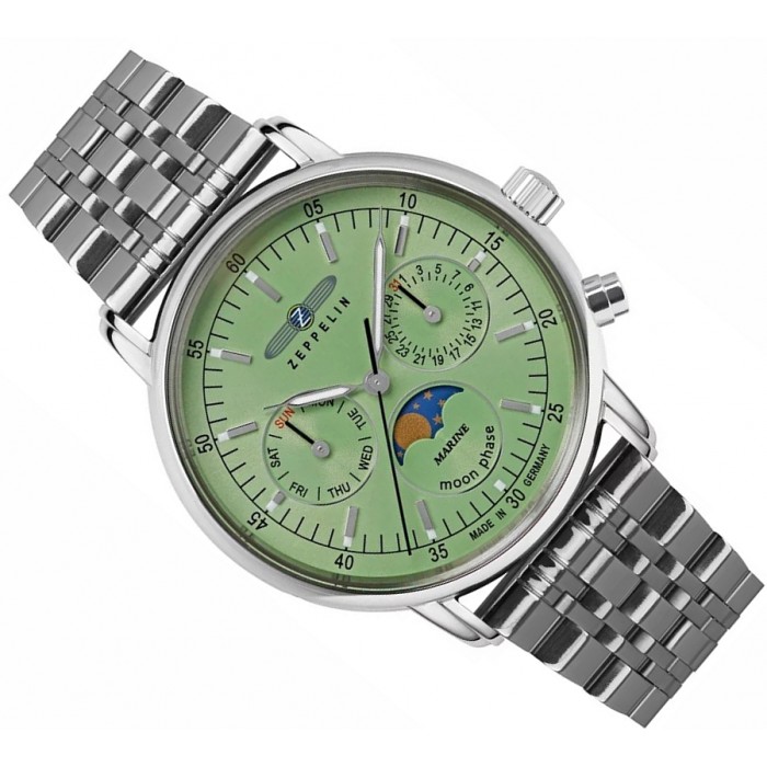 Zegarek damski ZEPPELIN 8637M-4 doskonale prezentuje się na nadgarstku. Sięgają po niego kobiety, które lubią wyróżniać się dzięki stylowym dodatkom, które dodają wyjątkowego charakteru. Ten niemiecki czasomierz wyróżnia się na tle innych, popularnych modeli dzięki dopracowanemu designowi w niepowtarzalnym wydaniu. Szwajcarski mechanizm kwarcowy Ronda 706 zapewni długowieczne i bezproblemowe działanie czasomierza. Tarcza z dwoma chronografami wskazującymi dzień tygodnia i miesiąca oraz wskaźnikiem faz księżyca posiada wyjątkowy kolor w tonacji jasnej zieleni o seledynowej barwie. Otacza ją koperta wykonana ze stali szlachetnej w odcieniu srebra. Całość dopina najmodniejsza w tym sezonie wygodna, pięcio-rzędowa, stalowa bransoleta. Szkiełko mineralne K1, dzięki któremu producent zabezpieczył tarczę i działanie wskazówek jest niezwykle odporne na stłuczenia. Wodoszczelność tego modelu to 5 ATM (50m), jest on więc odporny na zachlapania i chwilowe zanurzenia w wodzie.